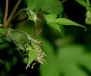 かなむぐら 秋の山野草2019.03.10カナムグラかなむぐら分類クワ科カラハナソウ属季節秋種類花撮影日2003/09場所金剛山かなむぐら(鉄ムグラ)日のあたる場所ならどこにでも蔓を伸ばしてはびこっている。強く痛いとげがあって蔓は引っ張ってもなかなか切れない程丈夫。とげのおかげで余り親しみがないが、花も地味で短い房になりよく見ると赤い模様が入っている。これはビールに入れるホップの仲間とのこと。いつか行ったビール工場の周りによく似た花を見た。これは雌花で、雄花は茎の先から穂状に伸びて白い小さな花が点々とつく。